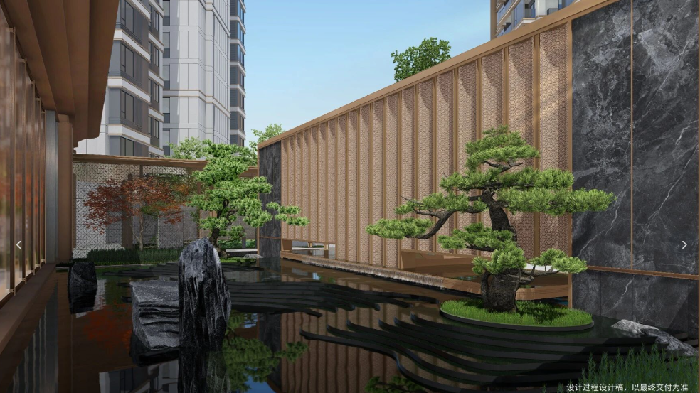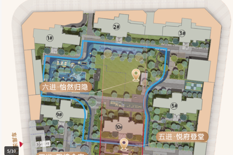 社区采用宋风造园精髓,打造“一轴六进八园”的宋风画卷,中心水苑藏纳宋风意境,玉带连廊环抱六进礼序。