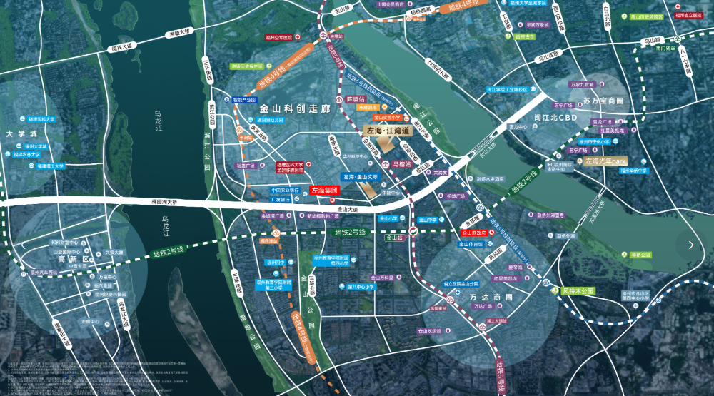 从地面交通看,项目周边主干路网发达,北接金山大道可快速通往鼓楼,南经浦上大道连接仓山核心区,西侧尤溪洲大桥直达台江。