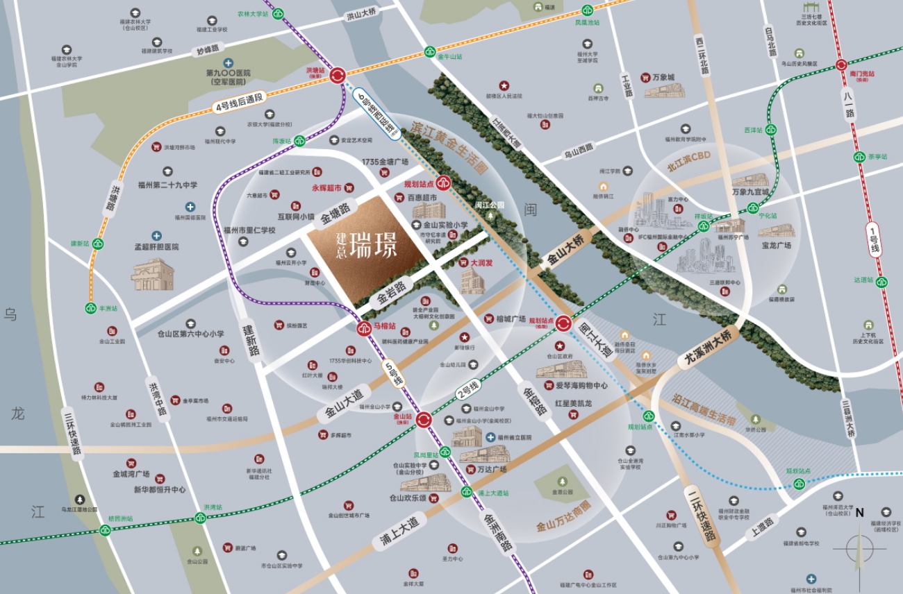 建总·瑞璟坐落于仓山区金塘路与金榕北路交叉口南侧,地处金山板块核心区域。这一区域经过多年发展,已成为福州成熟度较高的居住区,各类生活配套设施完善。