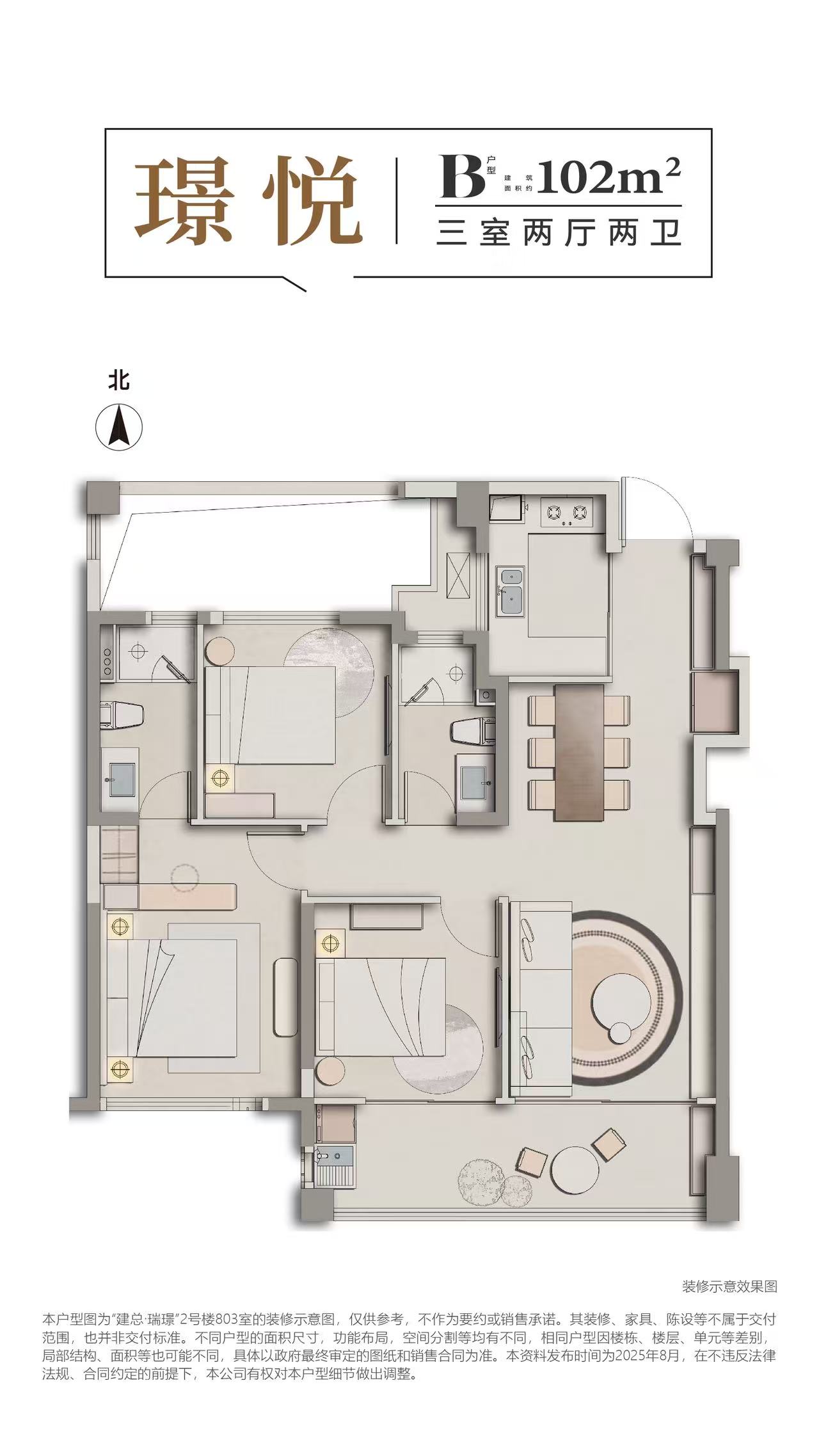 项目主打102-127㎡的三至四房户型,精准覆盖首置及首改需求。所有户型均采用板式结构,南北通透,采光通风性能优异。户型设计注重实用性,得房率超过85%,优于市场同类产品。