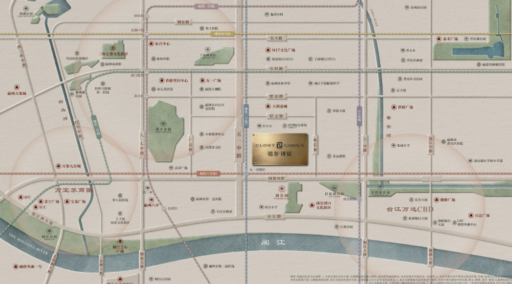 榕发锦樾坐落于福州台江区核心位置,具体在五一中路以东、国货西路北侧,处于福州传统中轴线上。